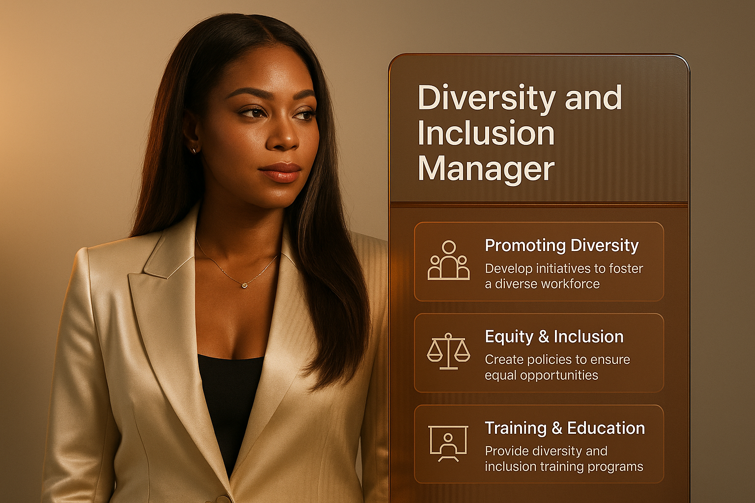 /Collection: /by davooda/Type: PNG/A professional portrait of a Diversity and Inclusion Manager, set against a smooth gradient background. The image features a stylish text block with key points on diversity initiatives, complete with icons and a cohesive design.