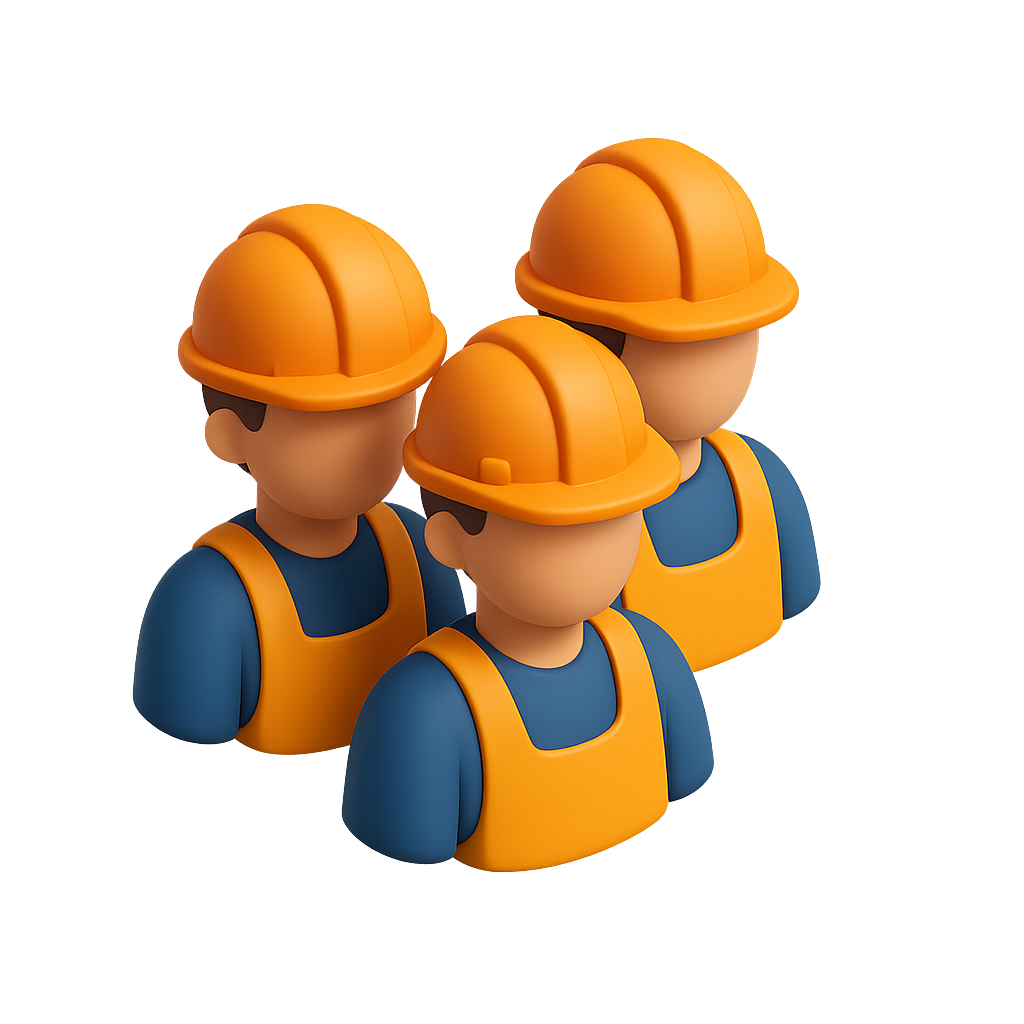 /Collection: /by davooda/Type: PNG/A stylized 3D icon featuring three construction workers wearing hard hats and safety vests. The design showcases a three-quarter view with a vibrant, volumetric feel against a soft gradient background.