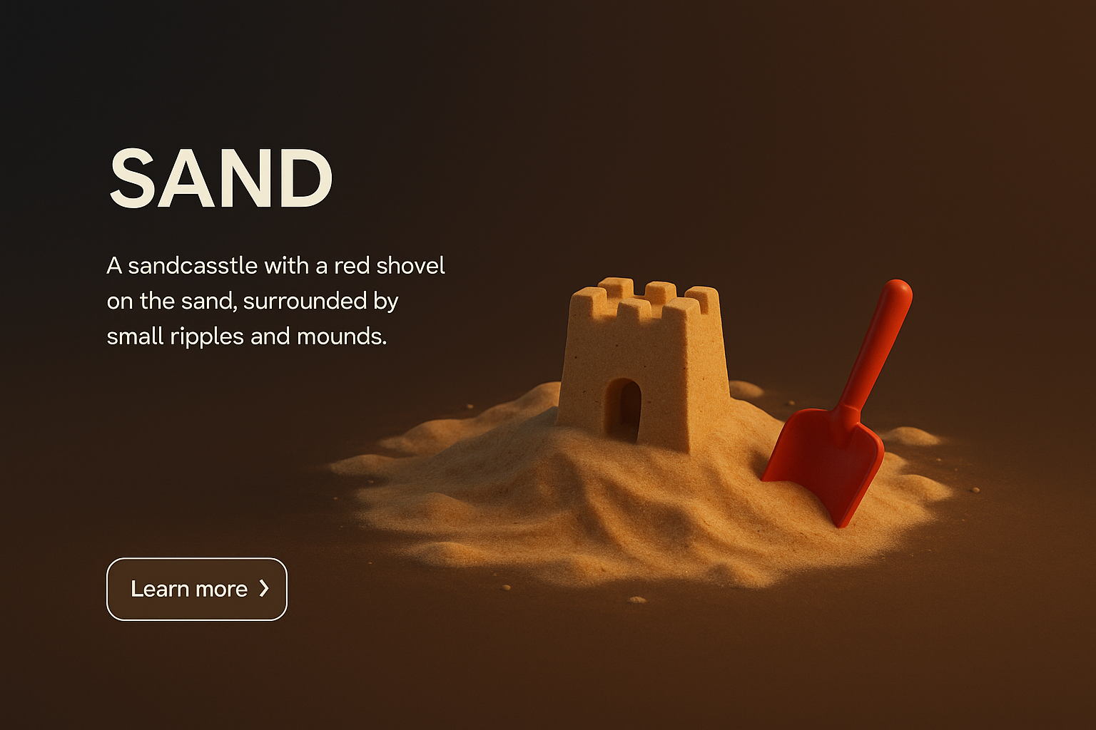 A detailed 3D representation of a sandcastle with a red shovel, set on a sandy surface. The scene features gentle ripples and mounds, creating a realistic beach-like atmosphere.