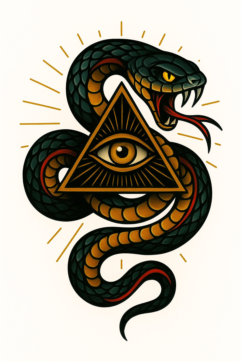 A colorful illustration featuring a snake entwined around a triangle with an eye, symbolizing mystery and knowledge. Suitable for tattoos or graphic design.