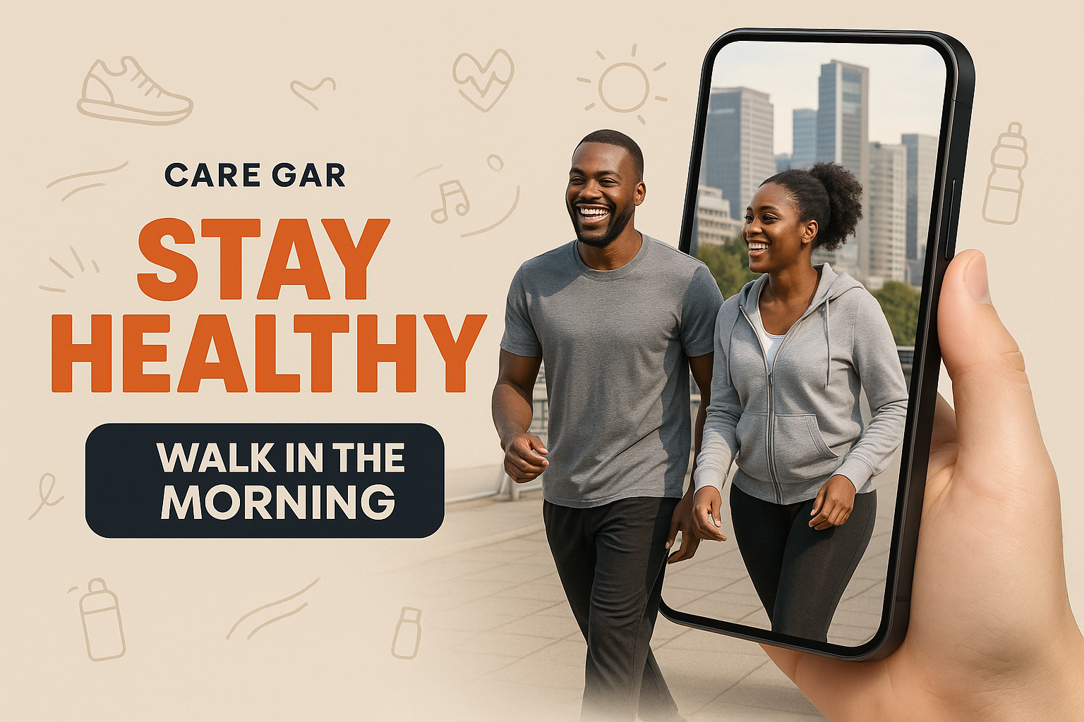 An African couple smiles while walking in an urban setting during the morning. The image features a smartphone displaying the scene, emphasizing health and exercise.