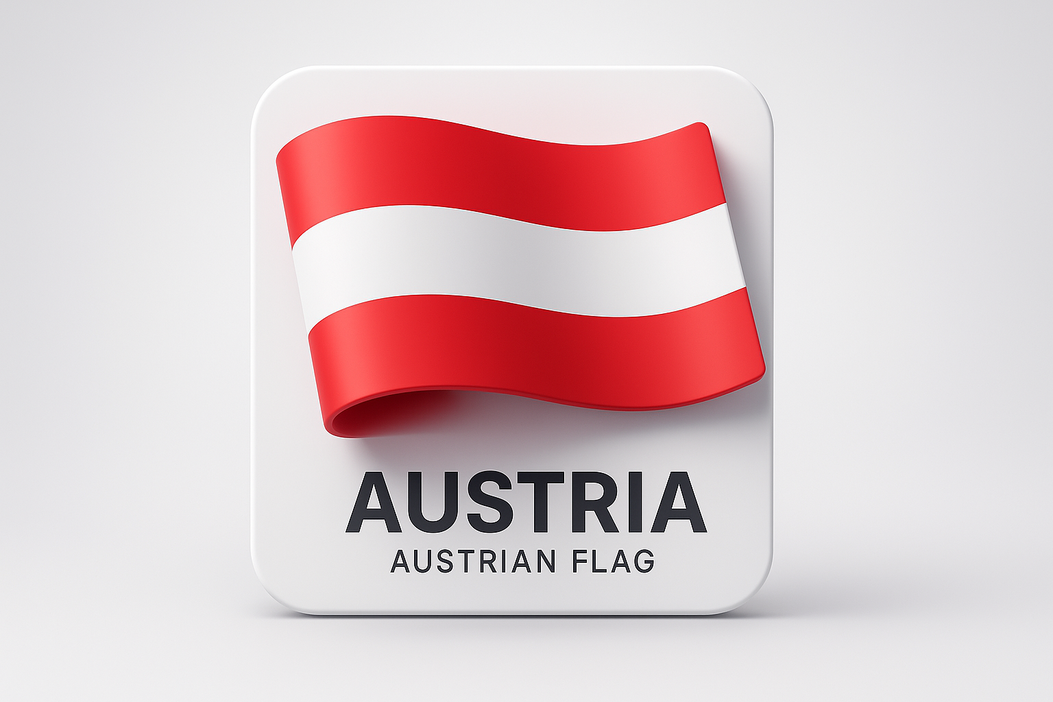A modern 3D icon depicting the Austrian flag, featuring bold colors and a wave effect. Ideal for travel, educational, or cultural applications.