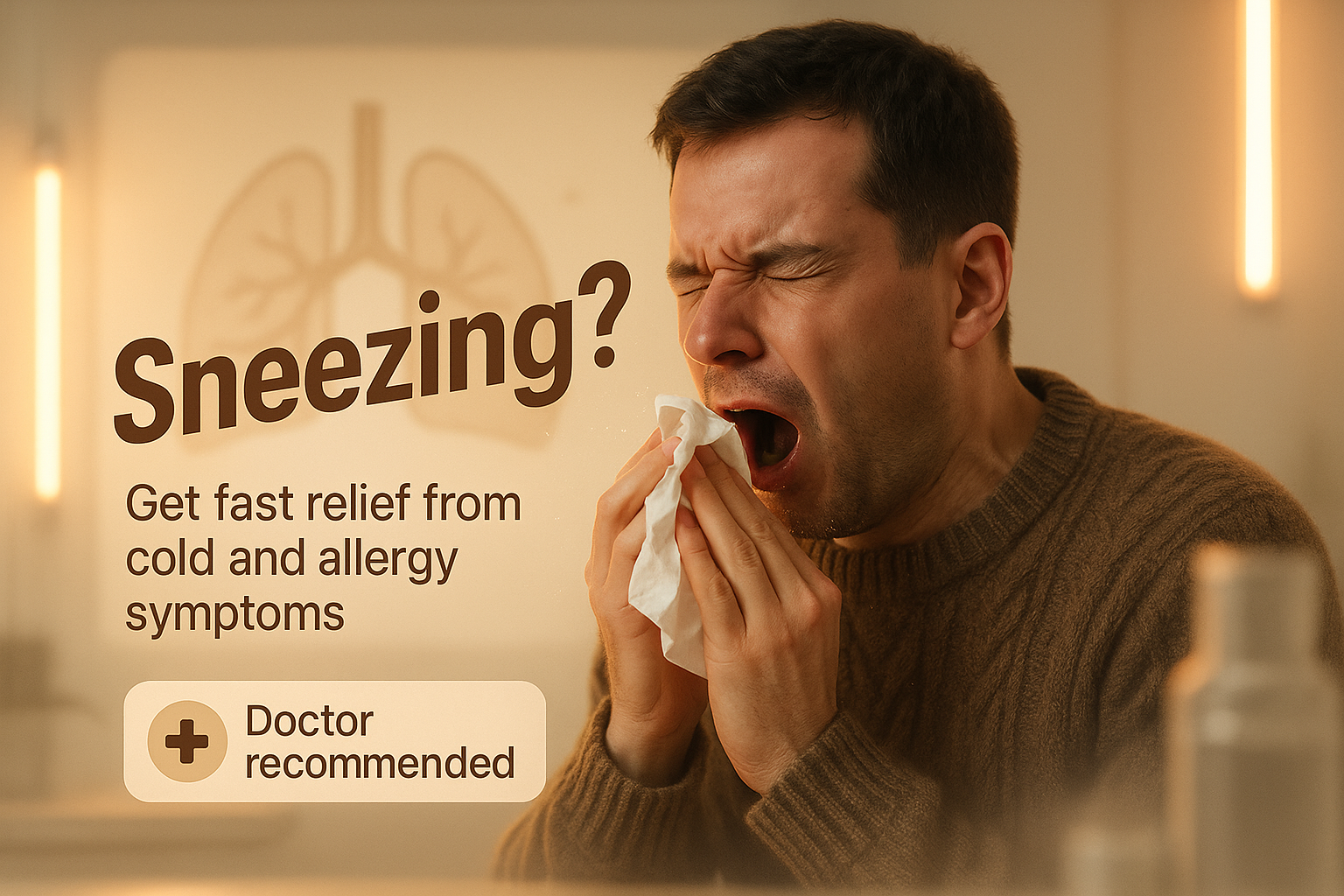 Engaging promotional banner highlighting relief for cold and allergy symptoms, featuring a distressed individual. Ideal for healthcare marketing.