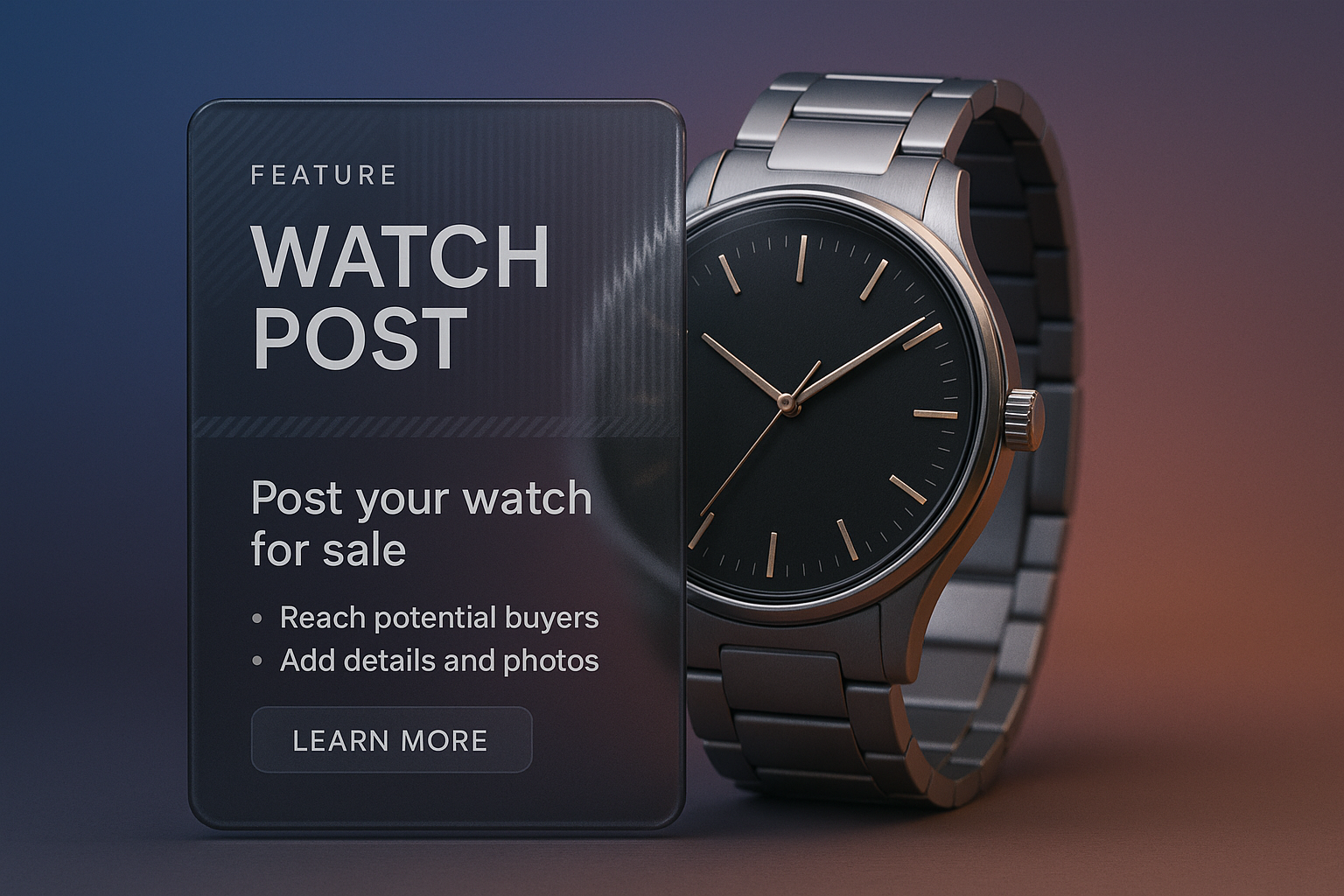A visually striking 3D illustration of a watch alongside a sleek, modern informational panel. The panel features a dark theme with clear text and subtle gradients in the background.