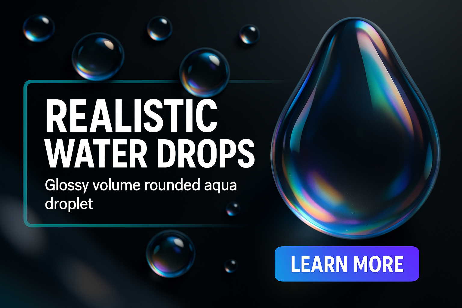 Stylized graphic featuring realistic water droplets with a glossy finish, ideal for product promotion or web design. The modern aesthetic enhances visual appeal.