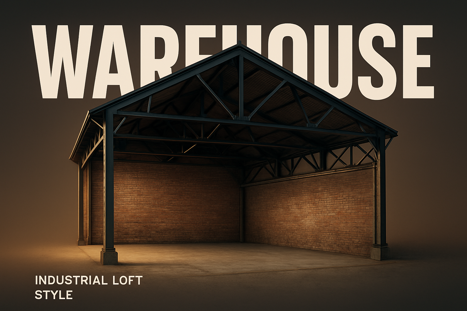 /Collection: /by davooda/Type: PNG/A stunning 3D rendering of an empty industrial warehouse interior with a brick wall and concrete floor. The black steel roof structure creates a bold minimalistic aesthetic, enhanced by dramatic lighting.