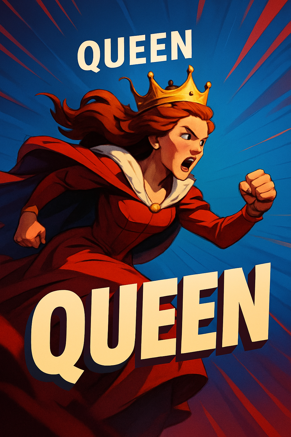 A powerful illustration of a queen in motion, showcasing dynamic lines and vibrant colors. The queen, wearing a crown and a red cape, exudes strength and determination amidst a striking background.