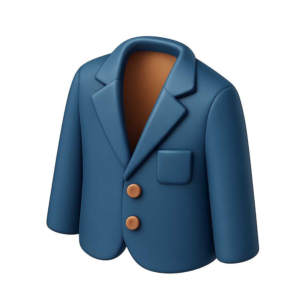 A three-dimensional representation of a blazer in a three-quarter view. The blazer features a blue color, brown buttons, and a pocket, all rendered with a smooth, volumetric feel against a dark background.