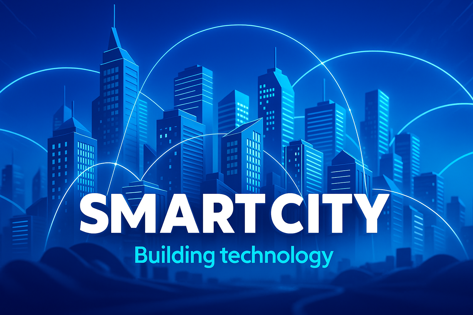 /Collection: /by davooda/Type: PNG/A vibrant digital illustration of a futuristic smart city featuring advanced building technology. The skyline is illuminated in blue, showcasing a dynamic urban environment with connectivity elements.