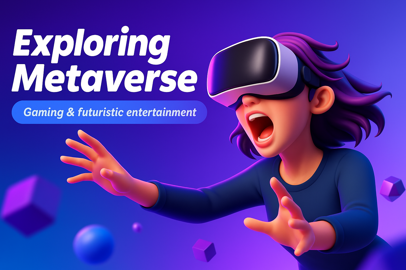 /Collection: /by davooda/Type: PNG/A young woman wearing a VR headset is immersed in a vibrant virtual world, expressing amazement as she interacts with floating geometric shapes. The dynamic composition captures the excitement of gaming and futuristic entertainment.