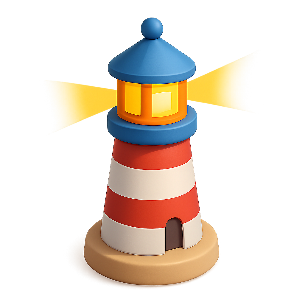 A vibrant 3D lighthouse icon featuring red and white stripes, a blue roof, and illuminated windows, set against a soft gradient background.