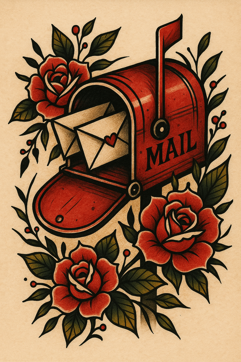 This image features a colorful tattoo-style illustration of a red mailbox with letters and roses. It conveys themes of nostalgia and love, suitable for tattoo enthusiasts or greeting card designs.