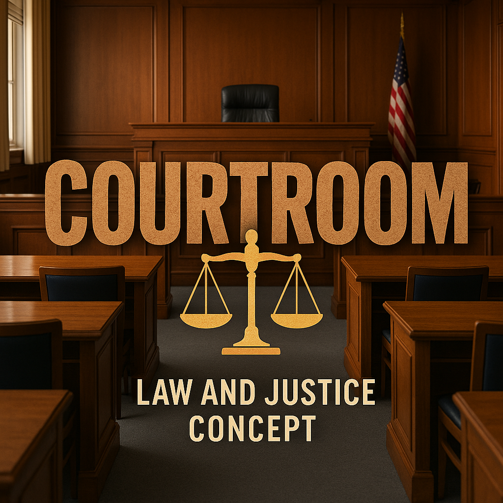 A courtroom interior image featuring wooden furnishings and a scale of justice symbol, ideal for legal discussions and justice-related themes.