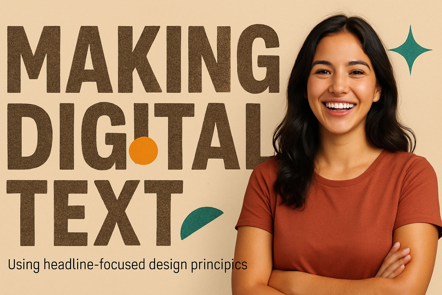 A promotional graphic featuring a smiling woman and bold typography, highlighting principles of digital text design. Ideal for educational or marketing content.