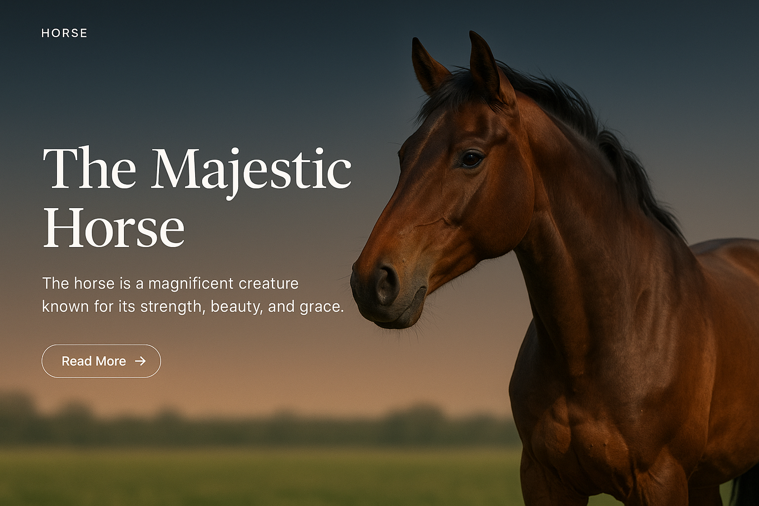 A stunning realistic illustration of a horse set against a gradient background. The horse is depicted with elegance, emphasizing its beauty and strength. The design includes text blocks and an action button.