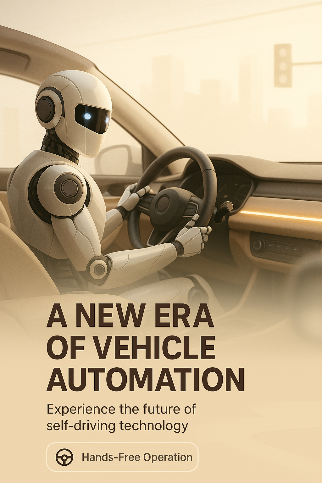 A visually striking illustration depicting a humanoid robot driving a car, symbolizing the future of vehicle automation and self-driving technology. Ideal for tech-related marketing and educational materials.