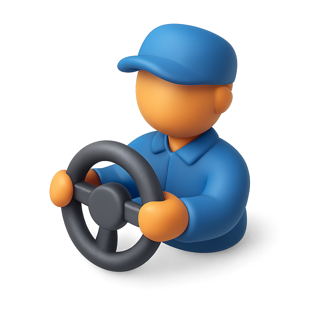/Collection: /by davooda/Type: PNG/A stylized 3D icon of a driver holding a steering wheel, depicted in a three-quarter view with a vibrant blue outfit. The background is transparent, enhancing the 3D effect.