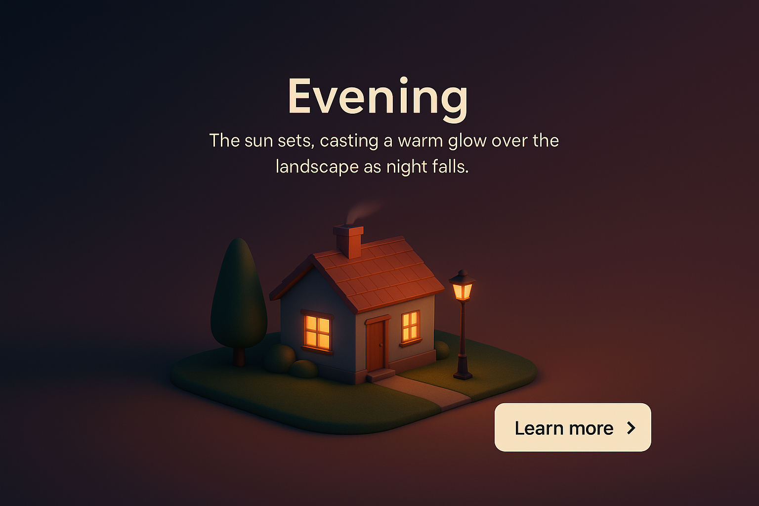 A serene evening scene featuring a small, cozy house with a warm glow, surrounded by a tree and a street lamp. The background transitions smoothly from dark to light colors, embodying a tranquil atmosphere.