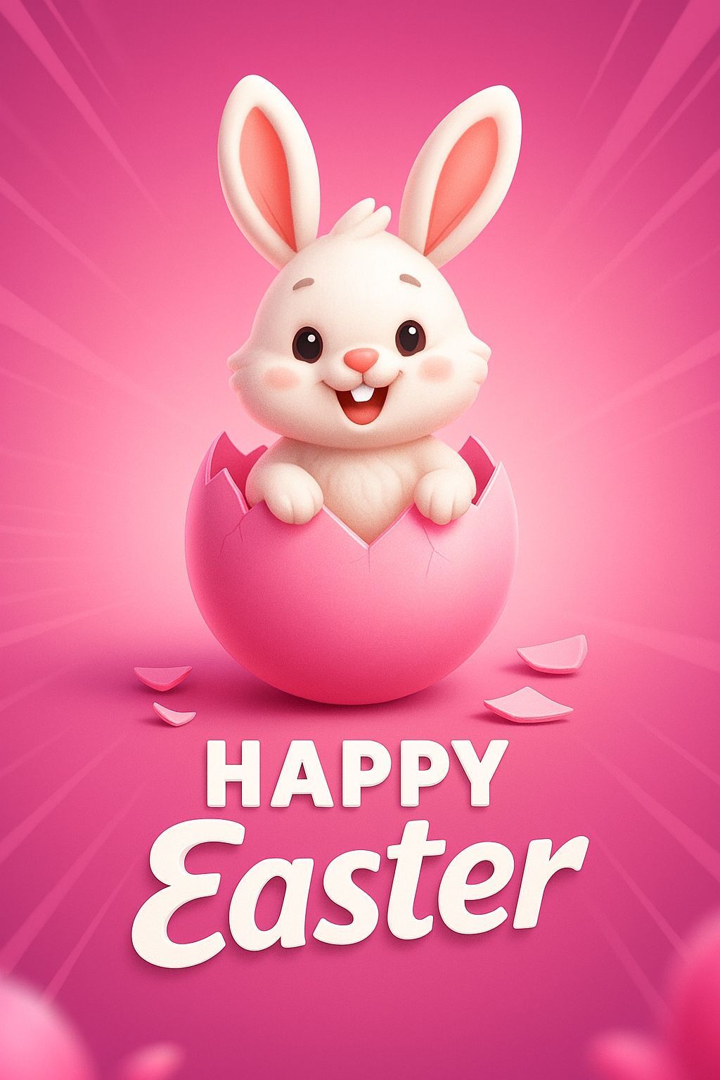 A delightful illustration of a cute Easter bunny hatching from a pink egg, set against a soft pastel pink background. The scene conveys joy and celebration.