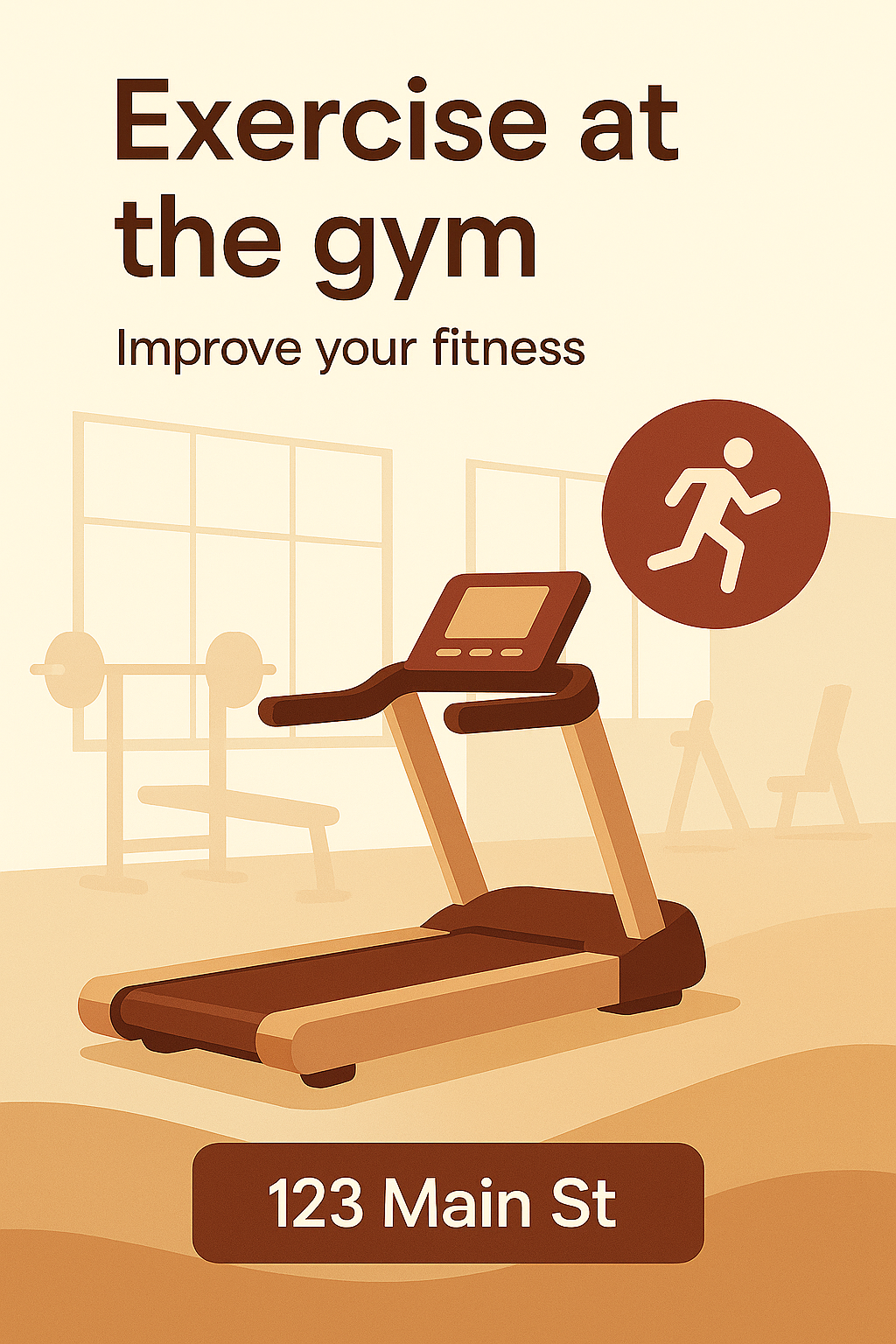 Stylish promotional graphic illustrating a treadmill in a gym setting, designed to encourage fitness and exercise. Ideal for marketing fitness centers or health-related initiatives.