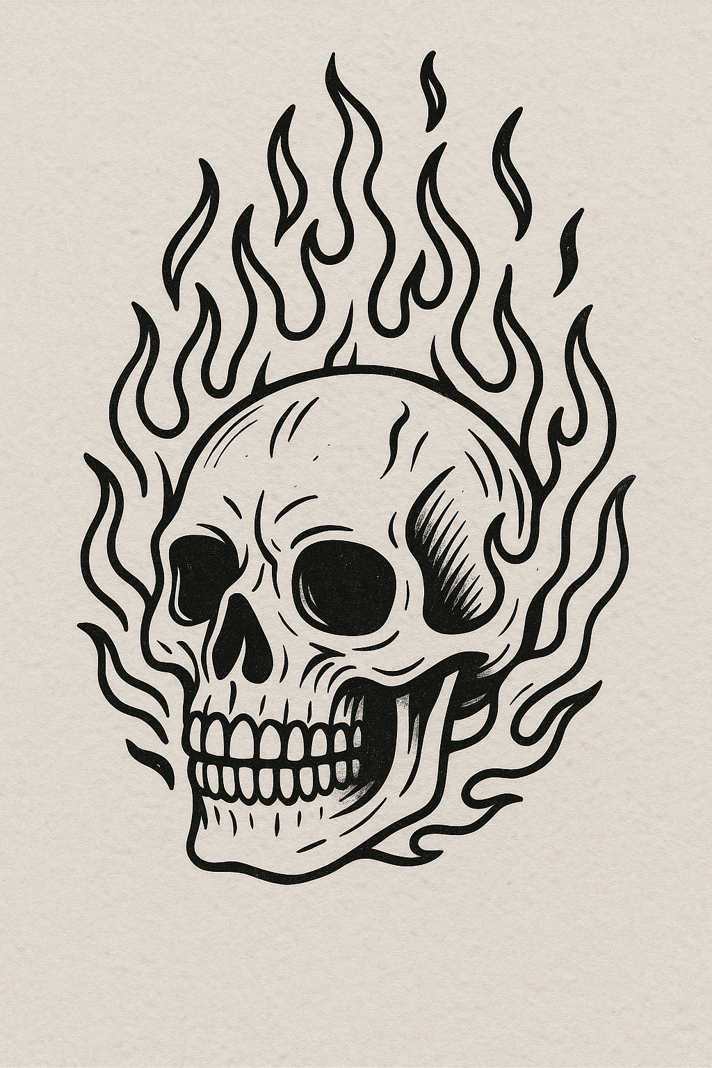 Stylized Skull with Flames Artwork for Tattoos or Merchandise