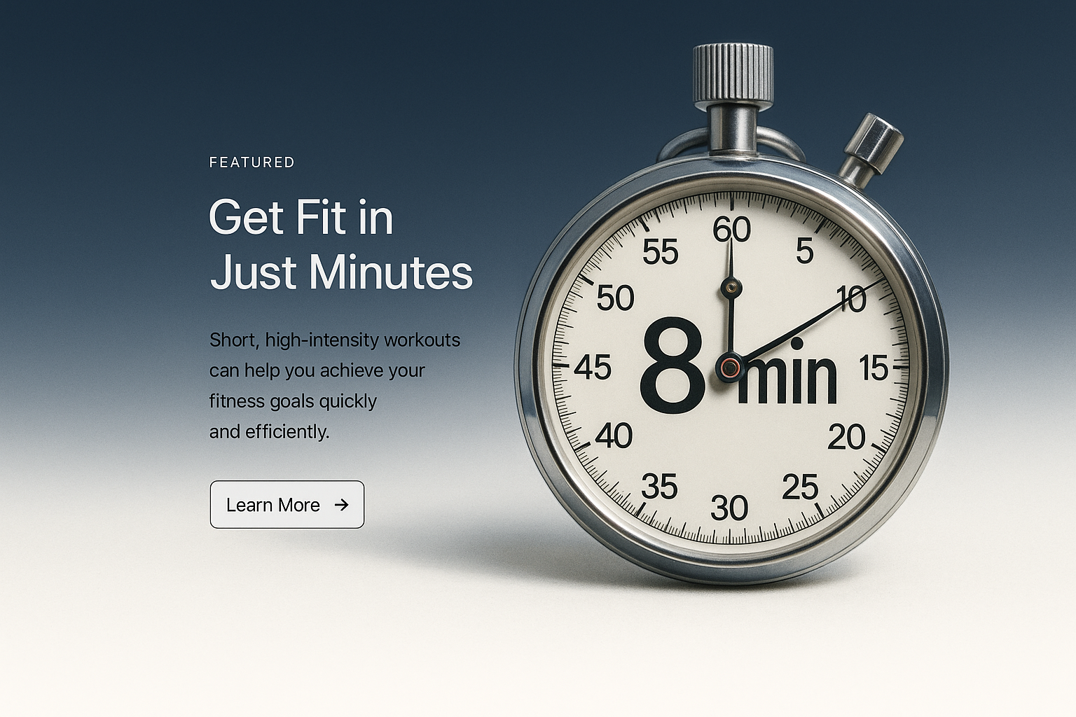 A realistic web design layout featuring a stopwatch with '8 min' highlighted. The background transitions from dark to white, enhancing readability and focus.