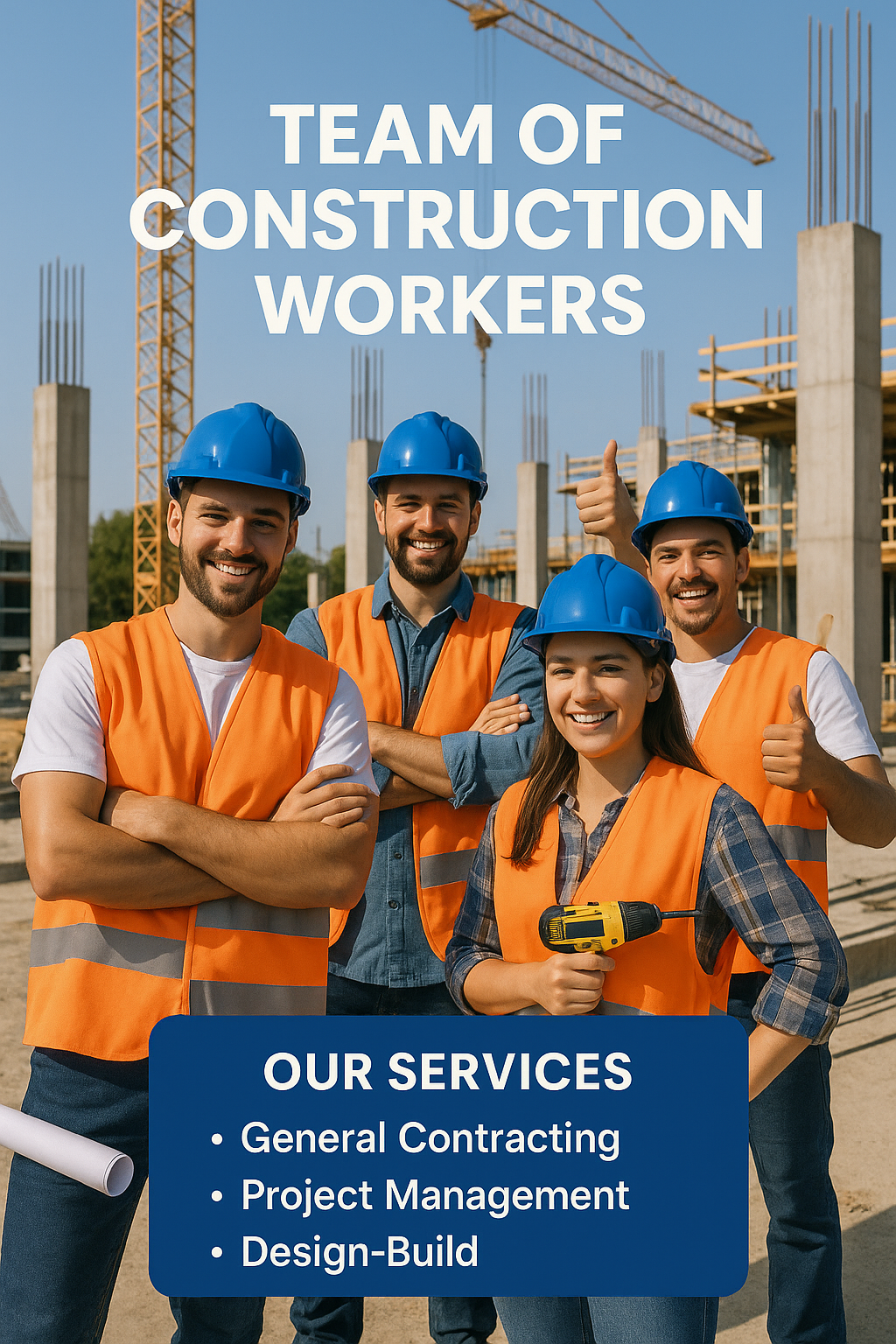 /Collection: , /by davooda/Type: PNG/Engaging promotional image showcasing a diverse team of construction workers on-site, ideal for marketing construction services. Bright colors and professional attire enhance the visual appeal.