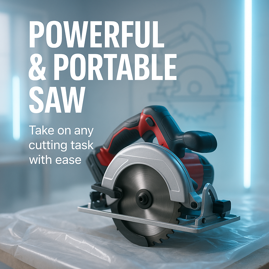 Realistic image of a powerful circular saw positioned on a workshop table, featuring modern design elements and soft lighting, ideal for tool marketing and advertising.