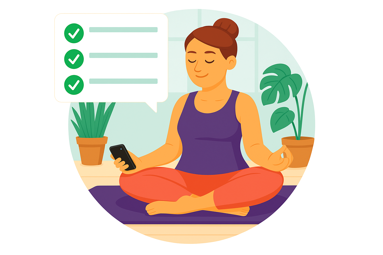 Colorful digital illustration depicting a woman meditating on a yoga mat while using a smartphone, ideal for wellness and mindfulness content.