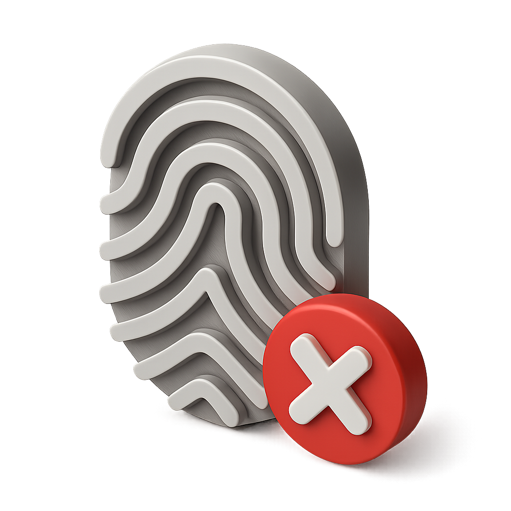 A three-dimensional icon featuring a fingerprint design with intricate lines, complemented by a red cross mark. The isometric perspective adds depth, set against a subtle gradient background.