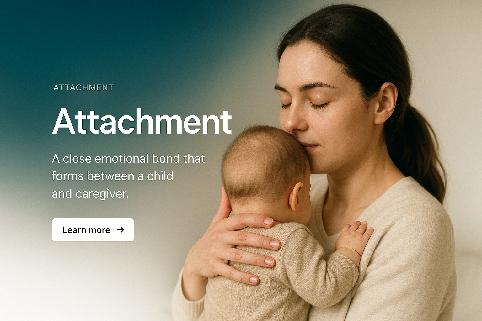 A contemporary web design featuring a caregiver and child, illustrating the theme of attachment. The layout includes a gradient background, a clear title, and a call-to-action button.
