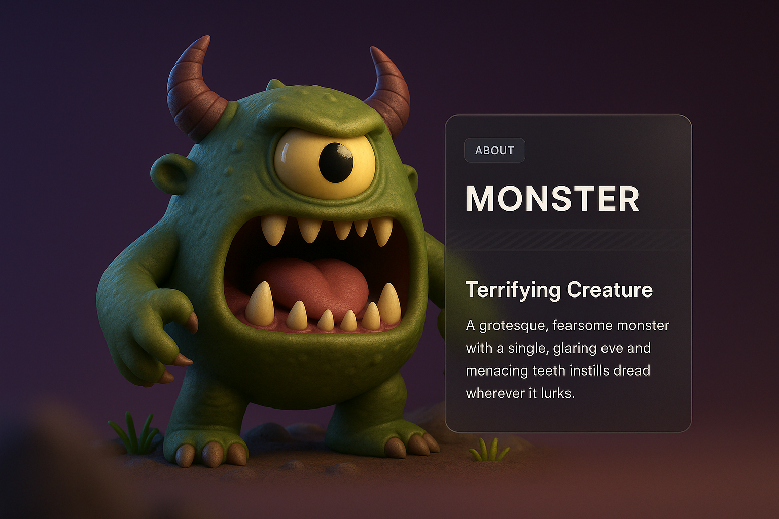 /Collection: /by davooda/Type: PNG/A vibrant 3D illustration of a grotesque monster with a single eye and menacing teeth, accompanied by an integrated information panel describing it as a terrifying creature.