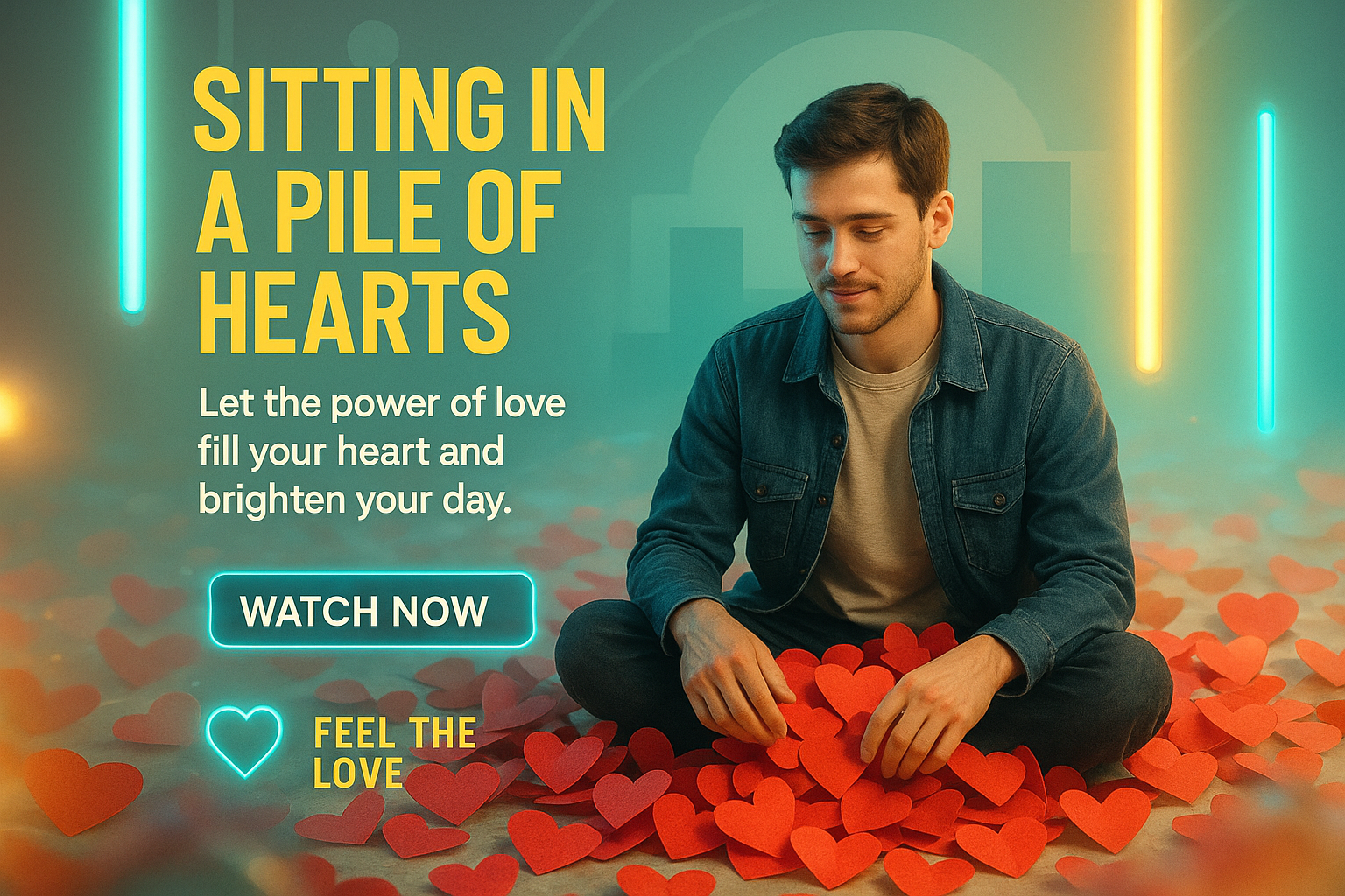 /Collection: /by davooda/Type: PNG/Engaging promotional image showcasing a man sitting among heart shapes, conveying themes of love and positivity. Ideal for social media campaigns or personal development content.