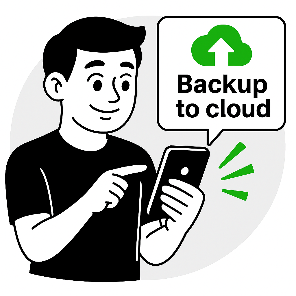 /Collection: /by davooda/Type: PNG/Vector graphic depicting a user interacting with a smartphone for cloud backup, featuring clean lines and minimalistic design suitable for tech-related content.