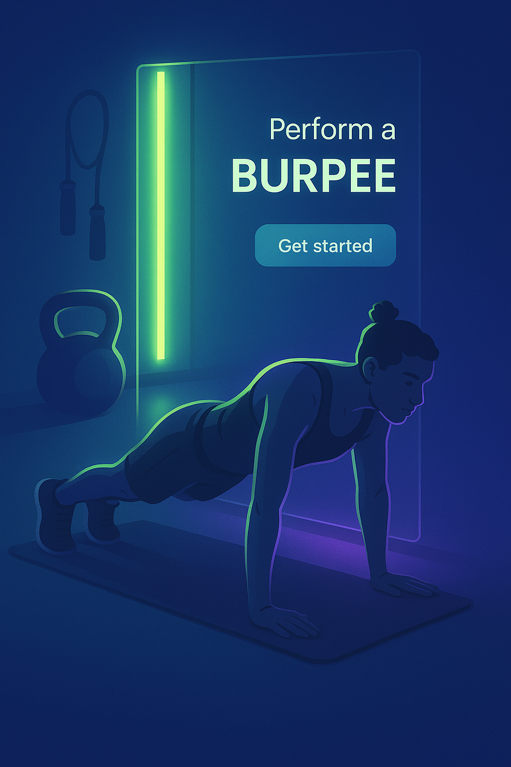 /Collection: /by davooda/Type: PNG/This image features a realistic representation of a person performing a burpee in a shadowy environment, highlighted by neon elements. The background is a solid blue, complemented by a glowing green strip.