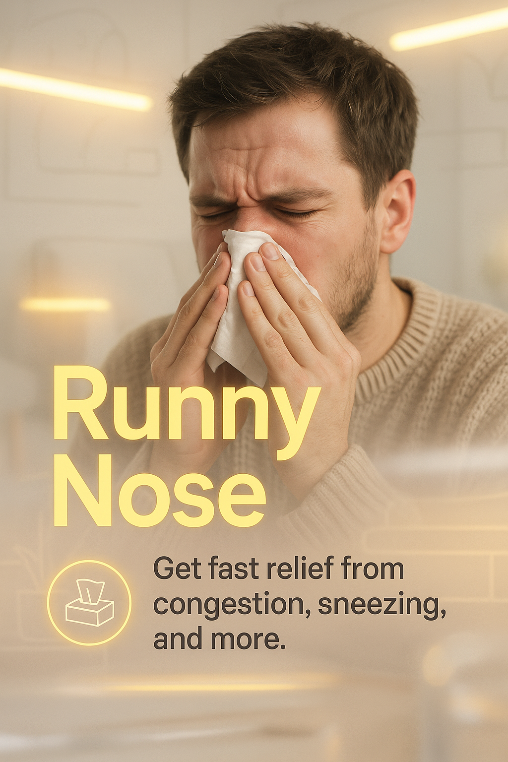 Informative health promotion graphic featuring a man experiencing symptoms of a runny nose, designed for allergy relief products. Suitable for digital advertising.
