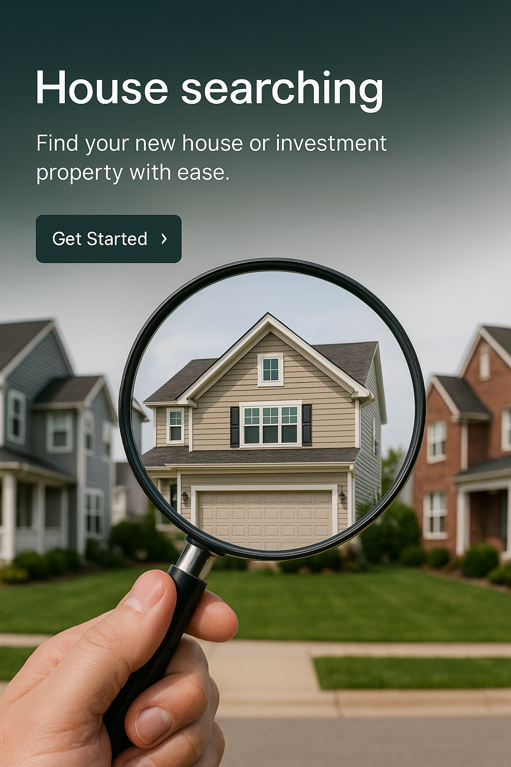 /Collection: /by davooda/Type: PNG/An engaging visual of a hand holding a magnifying glass focused on a house, symbolizing the search for real estate. The background features a neighborhood setting.