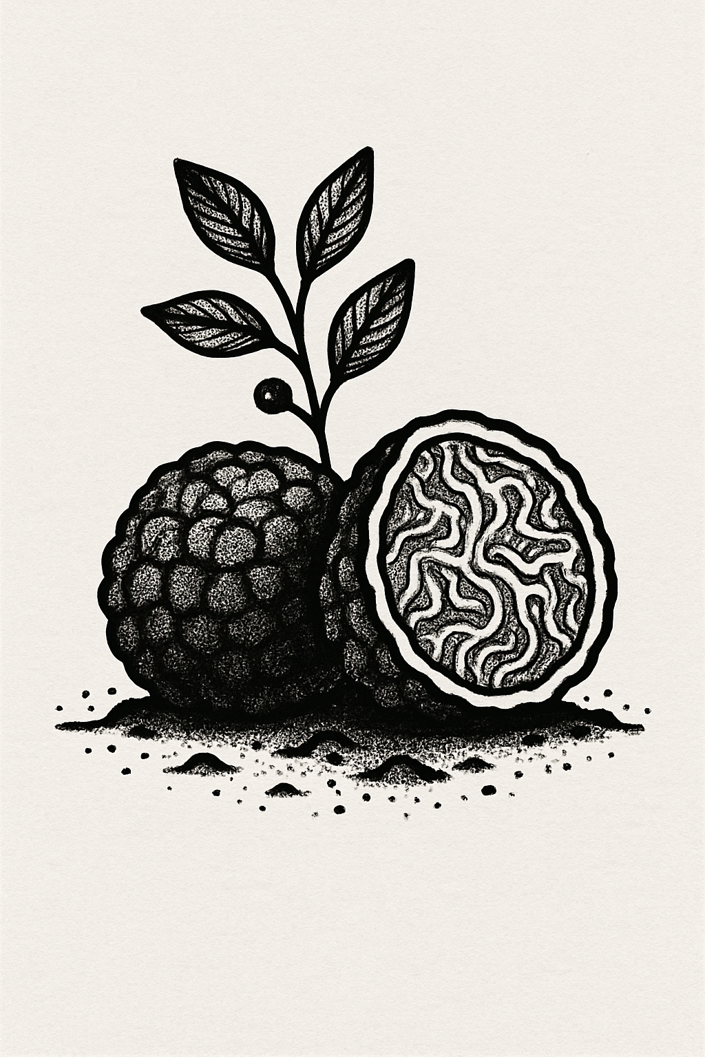 /Collection: /by davooda/Type: PNG/A detailed black and white illustration of lychee fruit, featuring a whole fruit and its cross-section. Ideal for food-related design projects or botanical art.