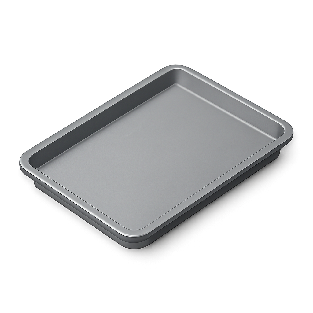 A sleek, 3D-rendered baking sheet pan displayed from a three-quarter angle with a transparent background. The design emphasizes a realistic volumetric appearance.