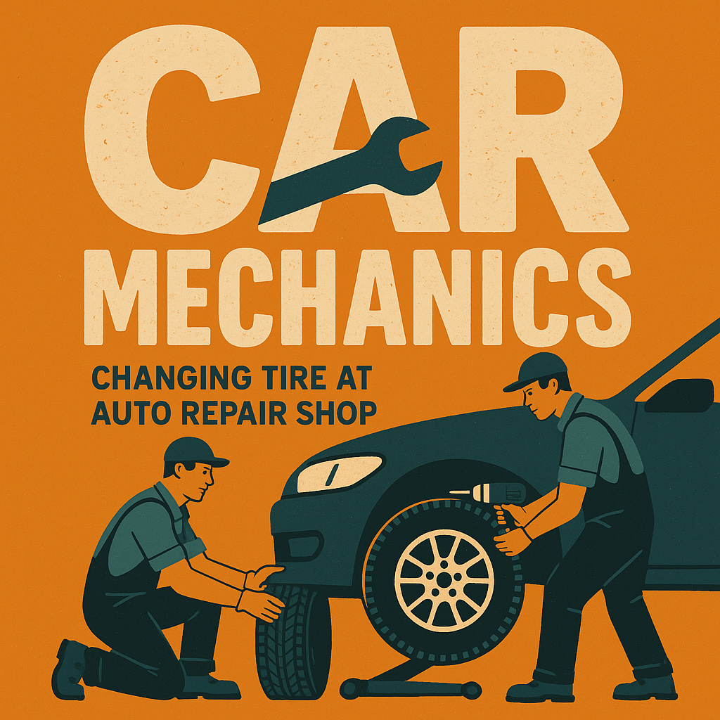 /Collection: /by davooda/Type: PNG/A vibrant illustration depicting car mechanics changing a tire at an auto repair shop. The graphic features bold typography and a warm color palette, aimed at automotive enthusiasts and repair services.
