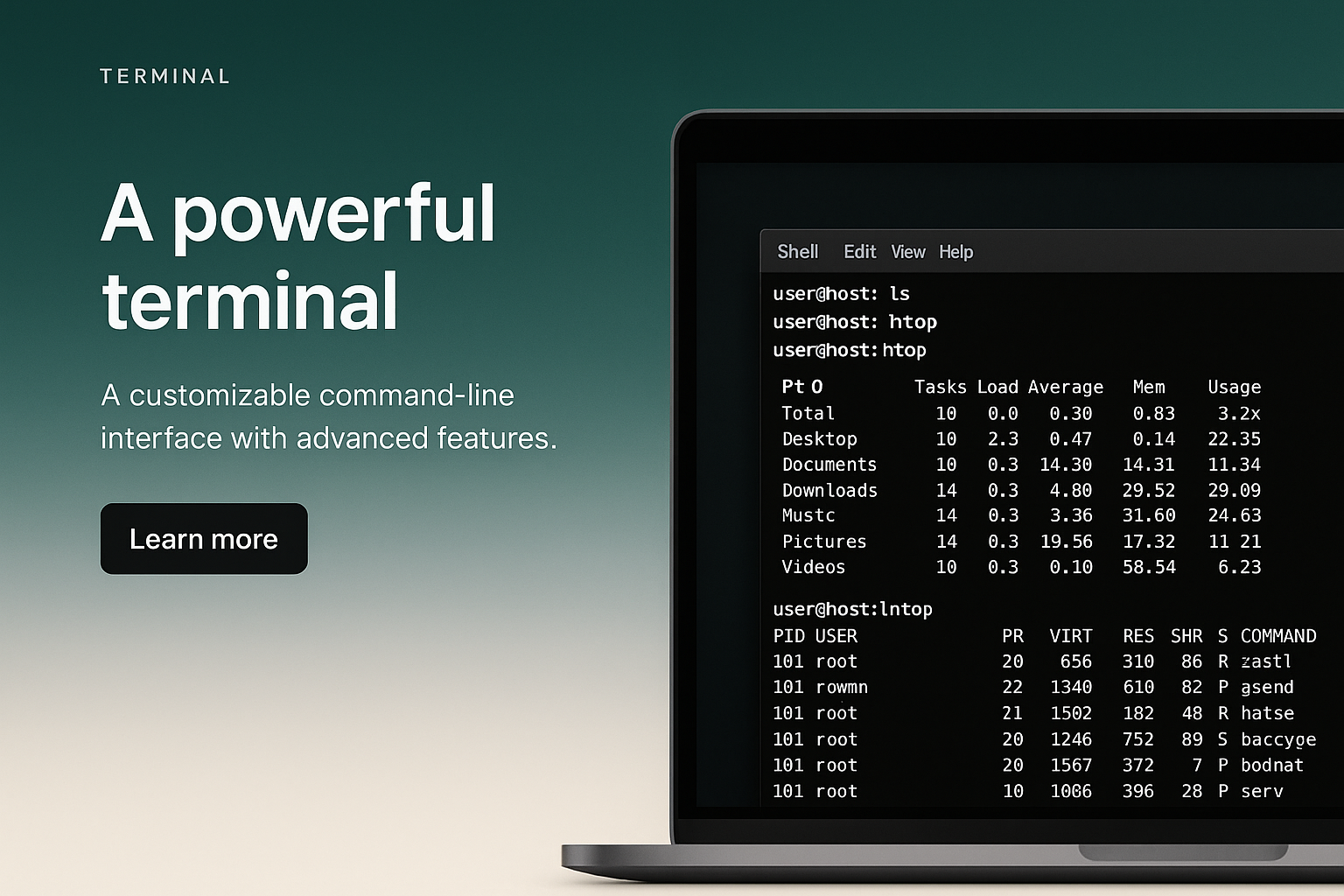 A sleek terminal interface displayed on a laptop, showcasing command-line features with a modern aesthetic. Includes a clear call-to-action button.
