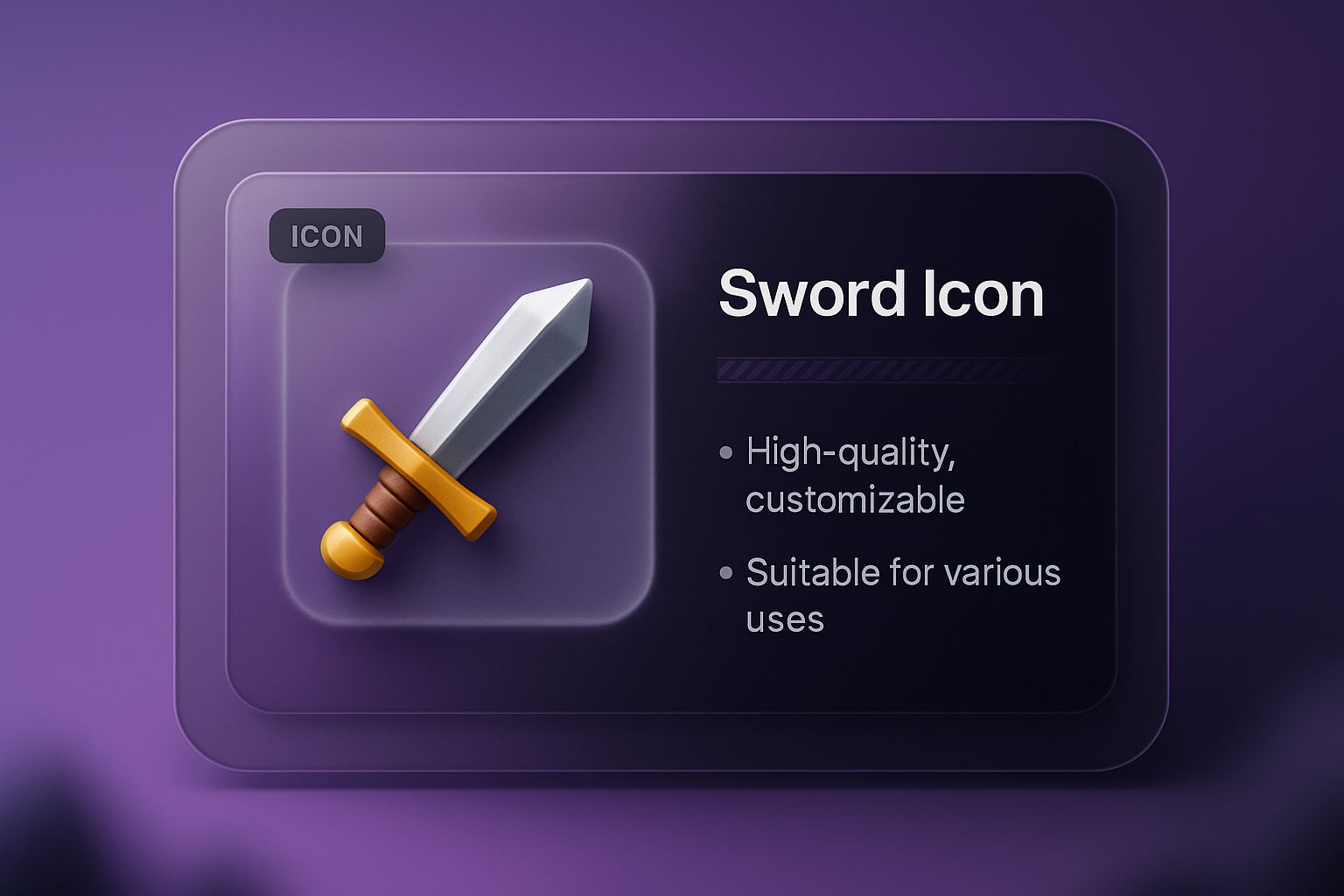 A sleek, 3D-rendered sword icon featuring a metallic blade and a brown handle. The design is integrated into a dark, transparent panel with customizable options.