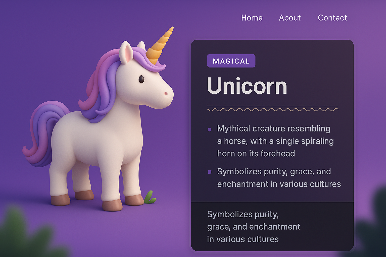 A whimsical 3D illustration of a unicorn with a vibrant gradient background. The design features text blocks integrated seamlessly, highlighting the unicorn's magical qualities.