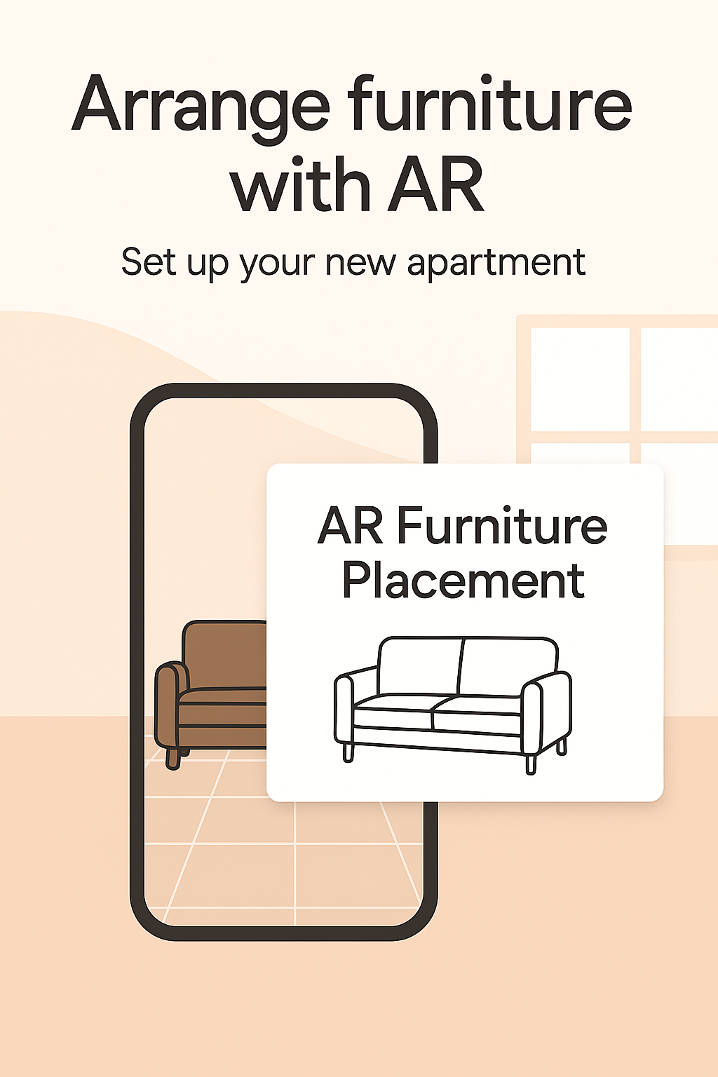 Informative graphic promoting augmented reality for furniture arrangement, featuring minimalist design and user-friendly visuals ideal for home decor apps.