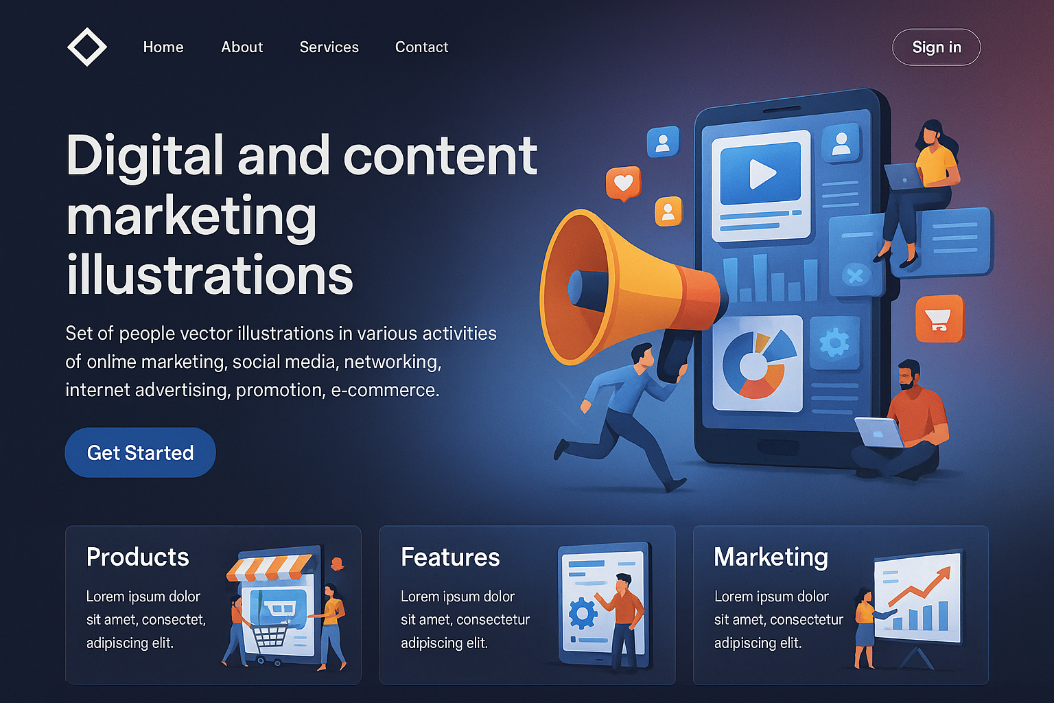 /Collection: /by davooda/Type: PNG/A dynamic landing page featuring digital marketing illustrations. It includes a large phone graphic, call-to-action buttons, and sections for products and features, all in a cinematic style.