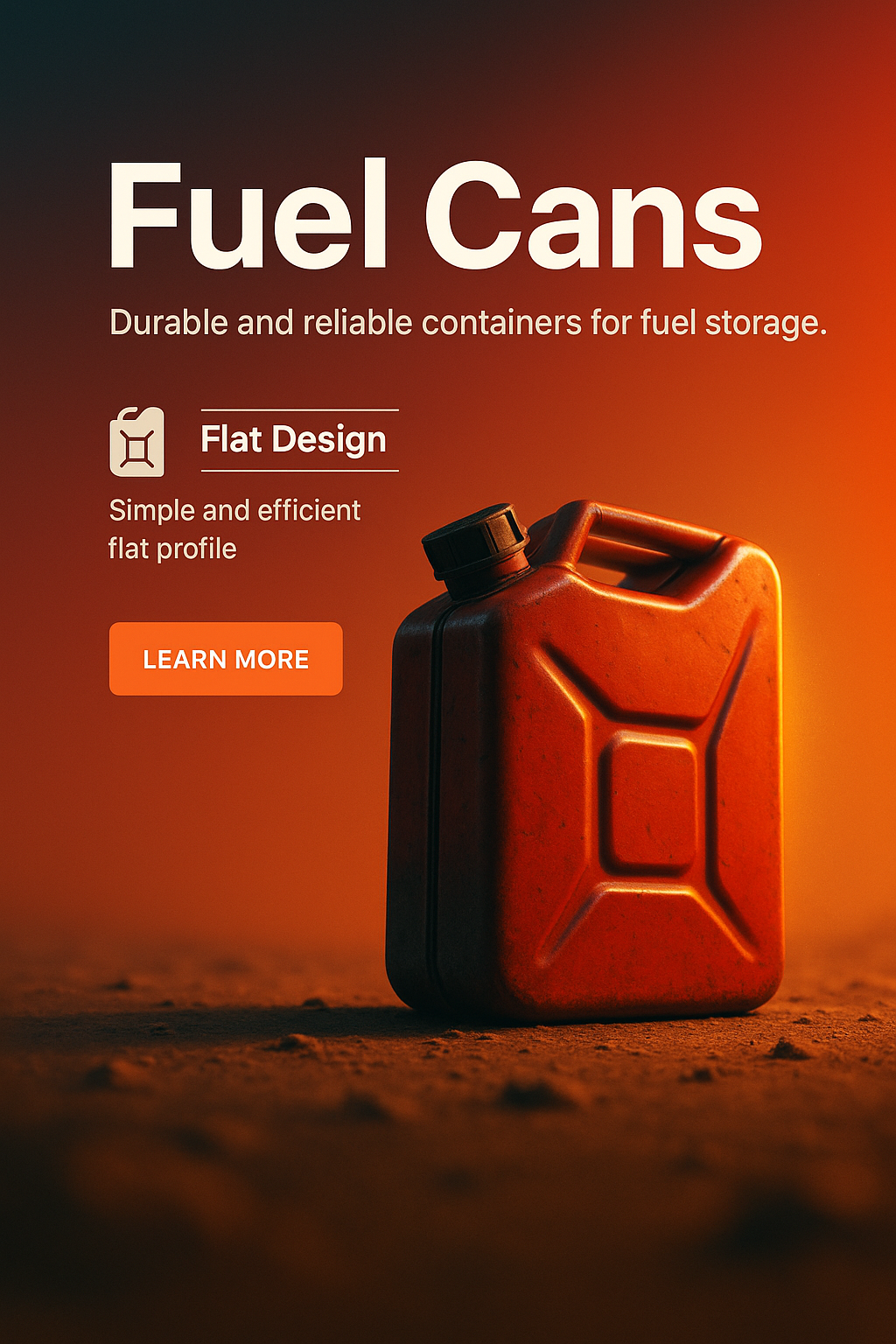 This image features a promotional graphic for fuel cans, showcasing a flat design style. It highlights durability and efficiency, ideal for marketing materials.