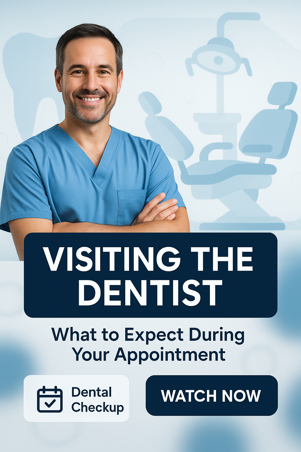 /Collection: /by davooda/Type: PNG/A visually appealing social media post designed to inform patients about what to expect during a dental visit, featuring a friendly dentist in a clinical setting.