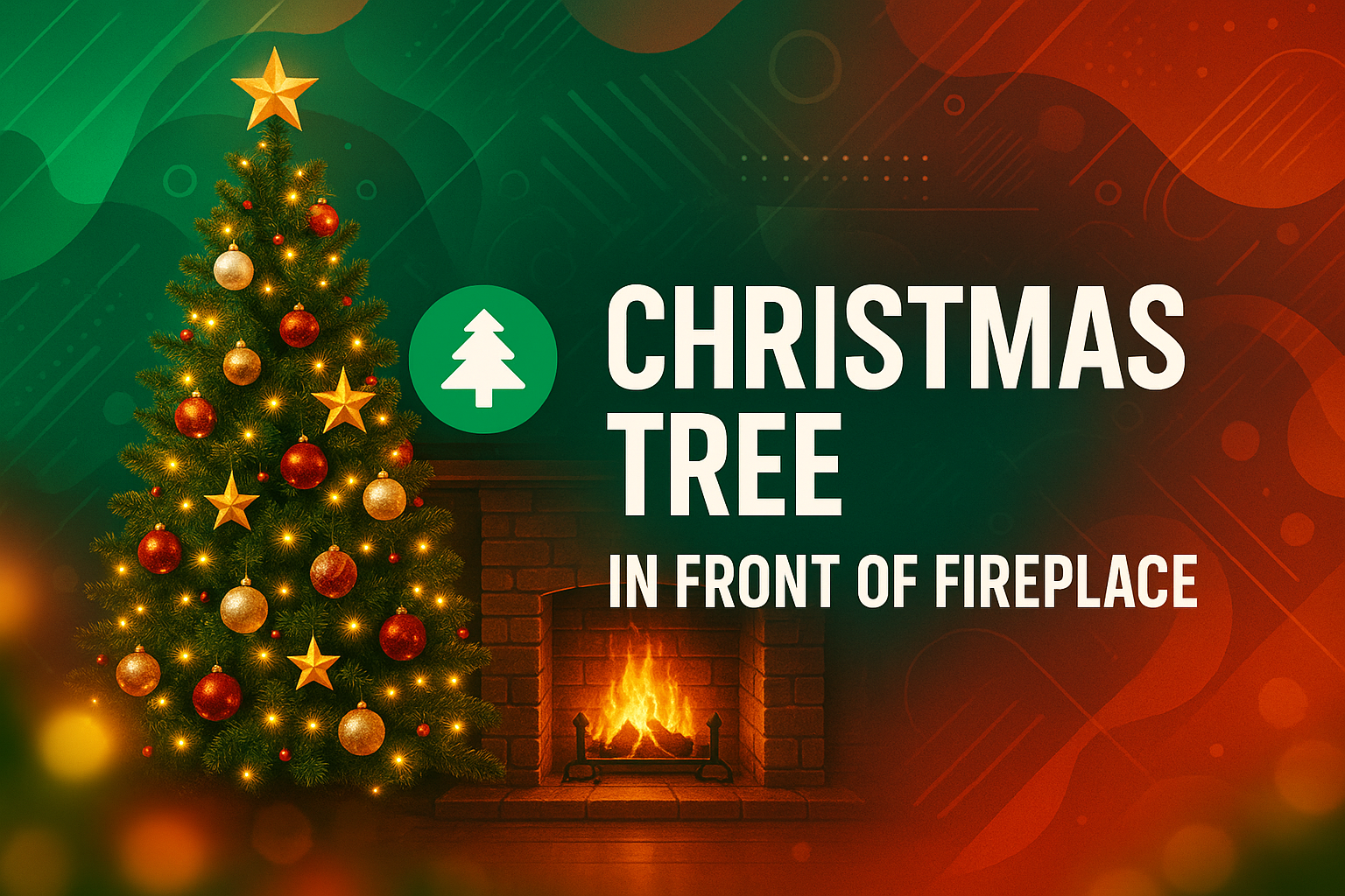 A vibrant holiday-themed graphic featuring a decorated Christmas tree in front of a cozy fireplace, ideal for seasonal promotions or festive social media posts.