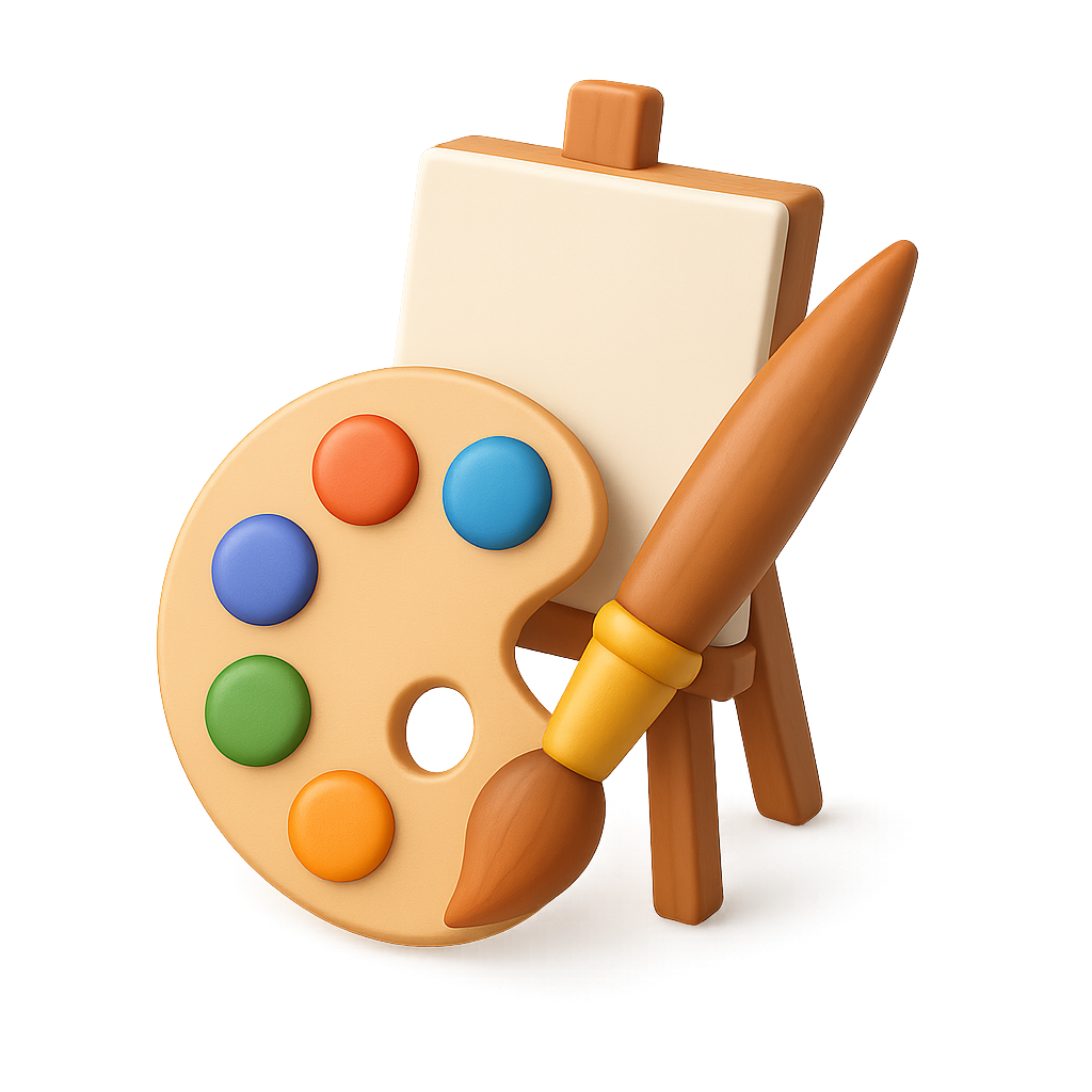 A vibrant 3D art icon displaying a painter's palette with colorful paint spots and a brush, set against a soft gradient background. The design features an isometric perspective.