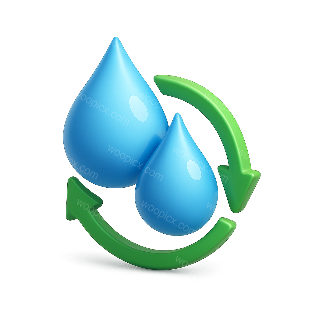 A visually striking 3D icon featuring two blue water droplets and a green recycling arrow. The design emphasizes an eco-friendly theme with a transparent background, rendered in a three-quarter view.